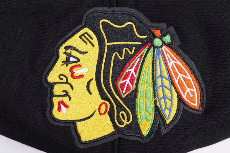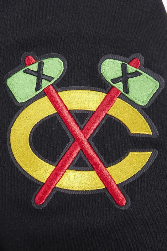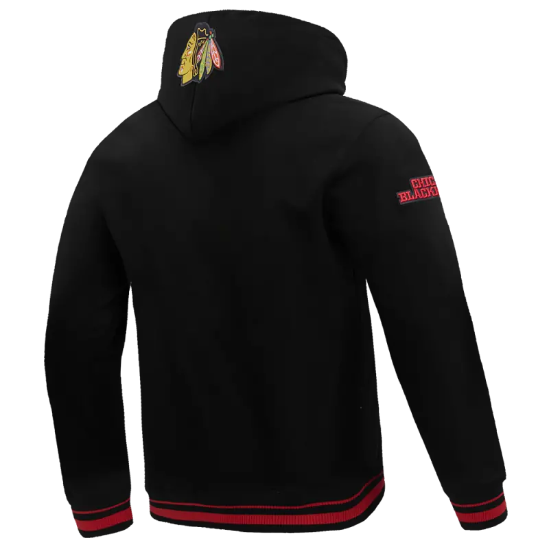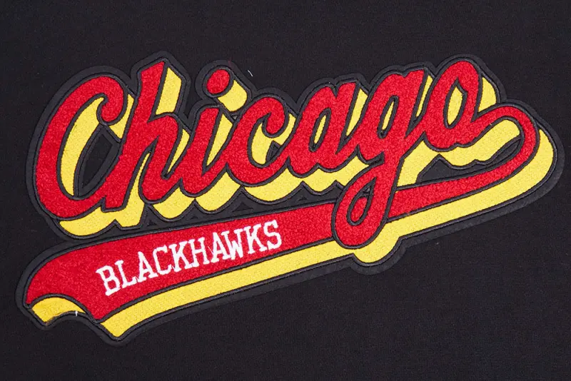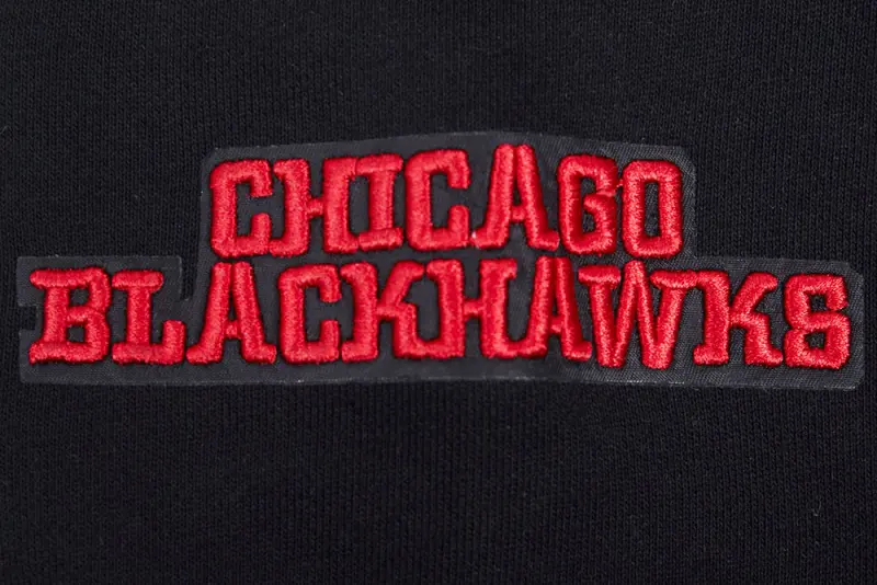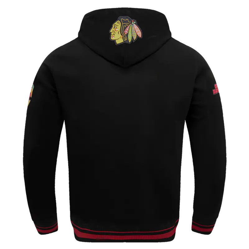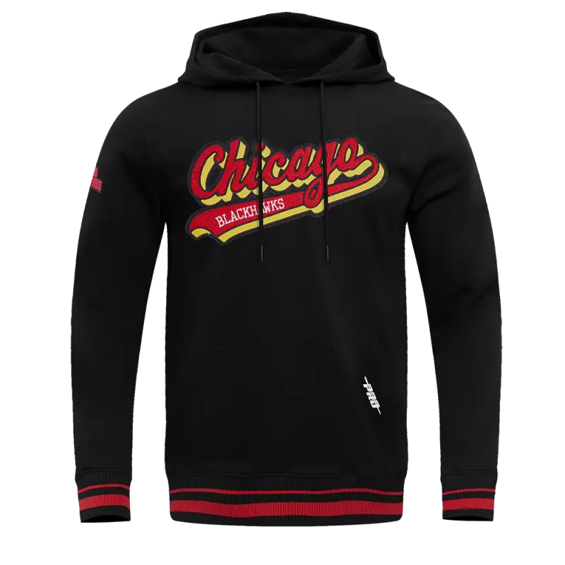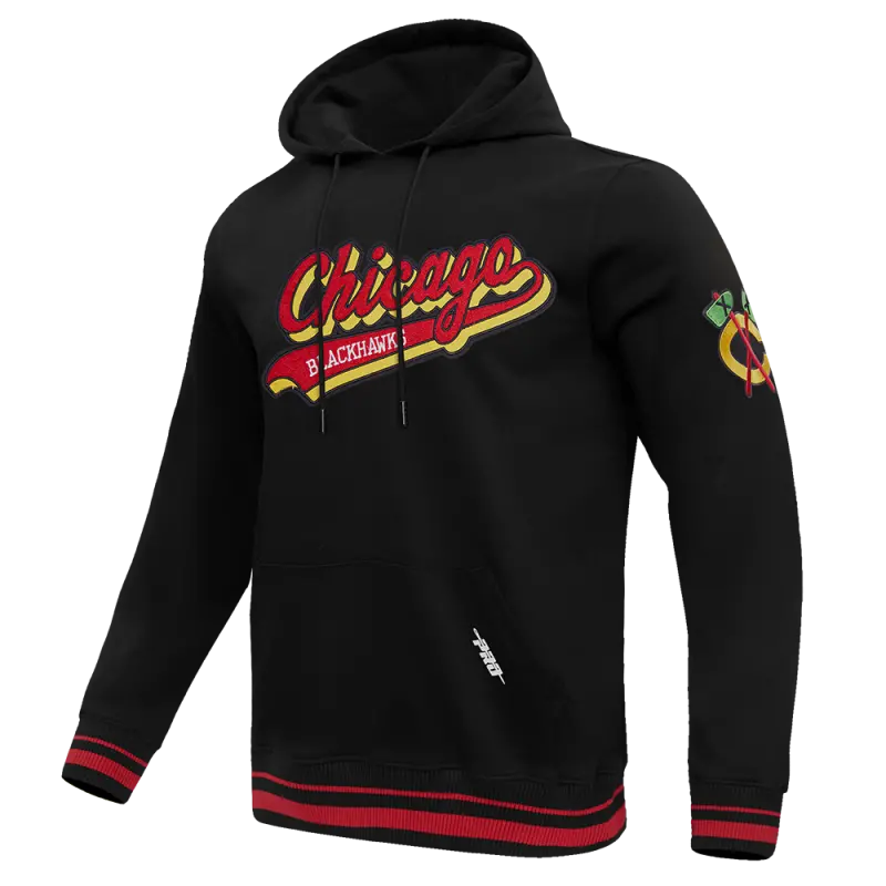 NHL CHICAGO BLACKHAWKS SCRIPT TAIL MEN’S RIB FLEECE PULLOVER HOODIE (BLACK\/RED\/BLACK)