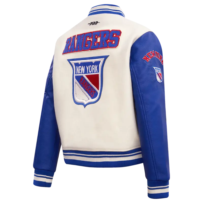 NHL NEW YORK RANGERS RETRO CLASSIC WOMEN’S RIB WOOL VARSITY JACKET (EGGSHELL\/ROYAL BLUE)