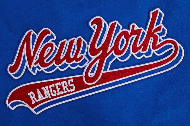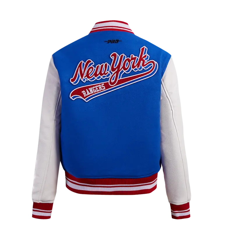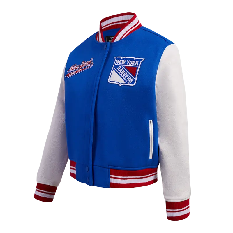 NHL NEW YORK RANGERS SCRIPT TAIL WOMEN’S WOOL VARSITY JACKET (ROYAL BLUE\/RED)